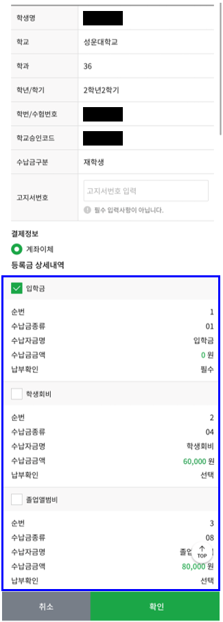 ![]() (등록금 고지서를 수령하지 못한 경우, 학교 홈페이지 > 종합정보시스템 > 등록금 고지서 메뉴에서 확인 가능) | |